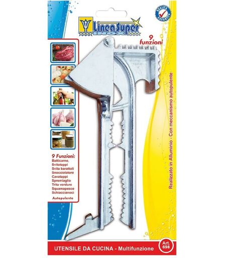 Corpo realizzato in alluminio. Meccanismo autopulente. Funzioni disponibili: batticarne, svitatappi, svitabarattoli, snocciolatore, cavatappi, spremiaglio, tritaverdure, squamapesce, schaccianoci. In blister. ...