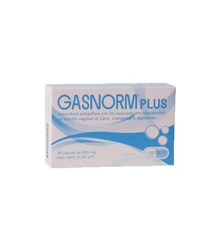 GASNORM PLUS - Integratore alimentare con Oli essenziali microincapsulati ed estratti vegetali di Carvi Camomilla e Agrimonia. L'olio essenziale di Anice Carvi Cannella e Finocchio similmente agli estratti vegetali di Carvi Camomilla ed Agrimonia possono contribuire alla regolare motilità gast… ...