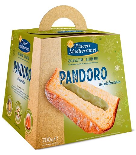 Piaceri Mediterranei PANDORO al pistacchio - Descrizione Prodotto senza glutine. Specialmente formulato per persone intolleranti al glutine. Ingredienti Burro, farcitura di pistacchi 15% (sciroppo di glucosio, zucchero, acqua, pasta al pistacchio 8%, olio di girasole, latte scremato in polvere, tuo… ...