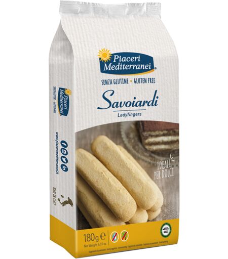 Piaceri Mediterranei - Savoiardi - Descrizione Biscotti Savoiardi. Senza olio di palma. Ingredienti Uova intere (32%) zucchero semolato fecola di patate farina di riso; emulsionanti: E471 E477; stabilizzante: sciroppo di sorbitolo; sale aroma vaniglia. Senza glutine. Caratteristiche nutriziona… ...