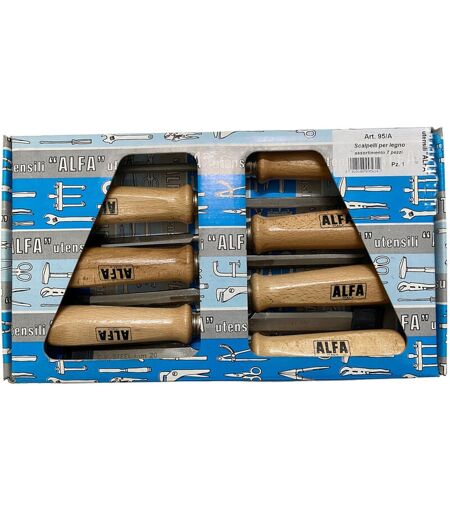 Assortimento 7 pezzi scalpelli angoli smussati manico legno ALFA Scalpelli intaglio legno Acciaio cromo vanadio Misura: 6 - 8 - 10 - 12 - 14 - 18 - 20 mm Prodotto di qualità LA FATTURA VIENE EMESSA PER ACQUISTI SUPERIORI A 20 € E VA RICHIESTA NEL MOMENTO DELL’ ACQUISTO ...