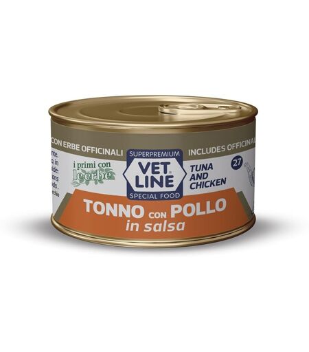 Vet Line Umido Tonno e Pollo in Salsa per Gatti Vetline 70g, alimento complementare per gatti in salsa, con erbe officinali.La formula Vet Line umido in Salsa per gatti è realizzata secondo i principi olistici utilizzando ingredienti di alto valore proteico e di alta digeribilità.Vet Line Umido Tonno e Pollo in Salsa per Gatti non contiene coloranti e conservanti artificiali.Made in Italy.Formato: 70g. COMPOSIZIONE:.Tonno 30%.Pollo 30%.Erbe officinali 0,5% (Linum Usitatissimum, Plantago Psyllium, Nepeta Cataria, Cynodon Dactylon) COMPONENTI ANALITICI:.Proteina grezza 11%.Fibre grezze 0,5%.Grassi grezzi 2%.Ceneri grezze 1%.Umidità 85% ADDITIVI NUTRIZIONALI (AL KG):.3a672c/Vit. A 1200 UI.3a700 Vit. E 15 mg.3a370 Taurina 150mg ...
