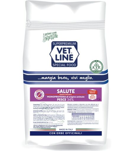 Vet Line Linea Salute Pesce Taglia Piccola per Cani Adulti VetLine è un mangime secco completo e bilanciato, con erbe officinali, studiato per il mantenimento di cani adulti a nutrizione controllata (obesi, anziani o con intolleranze alimentari). La formula Salute secco rappresenta la massima espressione del concetto ipoallergizzante sul mercato. Essa contiene ben nove erbe officinali titolate con provata efficacia a prevenire e curare tutte le patologie dei soggetti obesi, sterilizzati, anziani con intolleranze alimentari, dermatiti, artriti, forme reumatiche e con abbassamento della fertilità. Unica fonte proteica pesce fresco, disidratato e idrolizzato. Fonte glucidica senza glutini ne lieviti (negli ultimi anni sono sempre più frequenti i casi di celiachia nel cane e intolleranza ai lieviti fermentati). Integrato con olio di pesce ad alto contenuto in EPA DHA che assicura il giusto apporto di acidi grassi essenziali, per questi motivi è particolarmente indicata come coadiuvante nella terapia delle dermatiti. Made in Italy. Formati disponibili: 800 gr – 3 kg - 12,5 kg. COMPOSIZIONE: .Pesce 34% (pesce disidratato 18%, pesce fresco 8%, pesce idrolizzato 8%) .riso 22% .amido di piselli 14% .piselli 14% .grasso suino filtrato e stabilizzato* 6% .favino .semi di lino .olio di pesce .polpa di barbabietola essiccata .erbe officinali 0,5% (Lino, Ortica folia, Acerola, Tarassaco, Uncaria tomentosa, Santoreggia, Timo, Fucus, Aglio) .sostanze minerali COMPONENTI ANALITICI: .Proteina grezza 24% .Grassi grezzi 12% .Fibre grezze 2,5% .Ceneri grezze 7,9% .Calcio 1,35% .Fosforo 1,1% .Umidità 8,5% .Omega 6 2,8% .Omega 3 1,1% ADDITIVI NUTRIZIONALI (AL KG): .3a672a Vitamina A 18.500 UI/kg .3a671 Vitamina D3 1.200 UI/kg .3a700 Vitamina E 235 mg/kg .Rame (3b405 solfato di rame (II) pentaidrato) 10mg .Ferro (3b103 solfato di ferro (II) monoidrato) 90mg .Manganese (3b503 solfato manganoso monoidrato) 5,6mg .Zinco (3b605 solfato di zinco monoidrato) 130mg .Iodio (3b202 iodato di calcio anidro) 3,37mg .Selenio (3b802 selenito di sodio in granuli rivestiti) 0,28mg Energia Metabolizzabile (per Kg.): 3610 kcal SOMMINISTRAZIONE: Nel caso di cambio di alimentazione, si raccomanda di somministrare il nuovo alimento gradulamente. Lasciare sempre a disposizione acqua fresca. Si può servire secco o in aggiunta ad alimento umido. PESO (KG) ATTIVITA’ SCARSA ( ATTIVITA’ MODERATA (1-3h/gg) 126g30g244g51g474g86g6100g116g8124g144g10147g170g12,5174g201g ...