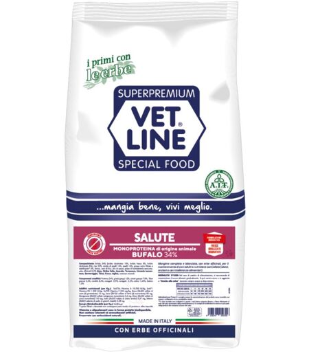 Vet Line Linea Salute Bufalo per Cani Adulti VetLine è un mangime secco completo e bilanciato, con erbe officinali, studiato per il mantenimento di cani adulti a nutrizione controllata (obesi, anziani o con intolleranze alimentari). La scelta della carne di bufalo presenta dei vantaggi unici, dimostrati da molti studi scientifici, consente di avere una monoproteina ipoallergizzante perché mai adoperata prima d’ora nella alimentazione del cane. E’ stato seguito anche in questa formula il concetto di alimentazione olistica che caratterizza tutta la linea Vet Line, utilizzando una sola fonte proteica: carne di bufalo fresca, disidratata e idrolizzata ed una fonte glucidica senza i glutini allergizzanti e lieviti. Le formule Salute, per il mantenimento di cani adulti a nutrizione controllata, rappresentano la massima espressione del concetto ipoallergizzante sul mercato. Contengono ben nove erbe offcinali titolate con provata efficacia a prevenire e curare tutte le patologie dei soggetti obesi, anziani, con intolleranze alimentari, dermatiti, artriti, forme reumatiche e con abbassamento della fertilità. Unica fonte proteica, fonte glucidica senza glutini né lieviti per evitare casi di celiachia nel cane e intolleranza ai lieviti fermentati. Integrate con olio di pesce ad alto contenuto in EPA DHA che assicura il giusto apporto di acidi grassi essenziali, per questi motivi è particolarmente indicata come coadiuvante nella terapia delle dermatiti. Made in Italy. Formati disponibili: 3kg – 12,5kg. COMPOSIZIONE: .Bufalo 34% (Bufalo disidratato 18%, Bufalo fresco 8%, Bufalo idrolizzato 8%) .riso 22% .amido di piselli 14% .piselli 14% .grasso suino filtrato e stabilizzato* 6% .favino .semi di lino .olio di pesce .polpa di barbabietola essiccata .erbe officinali 0,5% (Lino, Ortica folia, Acerola, Tarassaco, Uncaria Tomentosa, Santoreggia, Timo, Fucus, Aglio) .sostanze minerali * I grassi filtrati e decantati non contengono parti residue di proteine o altre impurità. COMPONENTI ANALITICI: .Proteina 24% .grassi grezzi 12% .ceneri grezze 7,8% .fibre grezze 2,5% .umidità 8,5% .Omega 3 0,9% .Omega 6 3,2% .calcio 1,45% .fosforo 1,2% ADDITIVI NUTRIZIONALI (AL KG): .3a672a Vitamina A 18.500 UI/kg .3a671 Vitamina D3 1.200 UI/kg .3a700 Vitamina E 235 mg/kg .Rame (3b405 solfato di rame (II) pentaidrato) 10 mg .Ferro (3b103 solfato di ferro (II) monoidrato) 90 mg .Manganese (3b503 solfato manganoso monoidrato) 5,6 mg .Zinco (3b605 solfato di zinco monoidrato) 130 mg .Iodio (3b202 iodato di calcio anidro) 3,37 mg .Selenio (3b802 selenito di sodio in granuli rivestiti) 0,28 mg Energia metabolizzabile (per Kg.): 3630 Kcal SOMMINISTRAZIONE: DOSE GIORNALIERA PER IL SOLO ALIMENTO SECCO: PESO (KG) ATTIVITA' SCARSA ( ATTIVITA' MODERATA (1-3h/gg) 125g30g590g100g12170g195g25295g340g40420g485g70635g735g Nel caso di cambio di alimentazione, si raccomanda di somministrare il nuovo alimento gradualmente. Lasciare sempre a disposizione acqua fresca. Si può servire secco o in aggiunta... ...