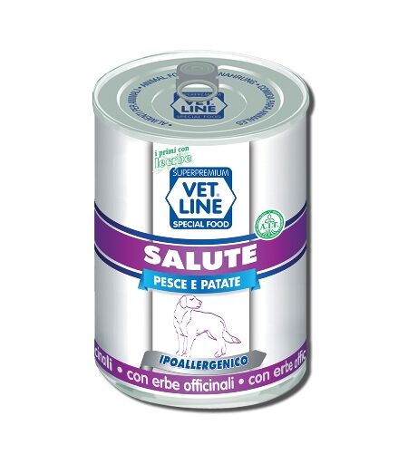VET LINE SALUTE Alimento completo e bilanciato per cani adulti a nutrizione controllata. È realizzato con pesce fresco, patate ed erbe officinali attive che ottimizzano il metabolismo del cane adulto a nutrizione controllata (anziani, obesi o con un regime alimentare non corretto). Anche negli umidi la formula Salute rappresenta il prodotto più versatile capace di sopperire alle più diverse esigenze. Disponibile nelle sue diverse formulazioni pesce, pollo o tacchino da preferire a seconda dei gusti o specifiche esigenze di diete ad esclusione. L'utilizzo delle patate rende questo prodotto indicato per i soggetti diabetici, in quanto i loro amidi destrinizzati (cotti) si trasformano in energia immediatamente disponibile che non residua. L'integrazione di erbe officinali è analoga a quella utilizzata nella formulazione Salute secco, mantenendo le stesse benefiche caratteristiche per un perfetto abbinamento dei due prodotti. Non contiene coloranti né conservanti. Gusto: pesce con patate. Ingredienti Pesce intero fresco (36%), patate, proteine vegetali, sostanze minerali, erbe officinali attive (lino, aglio, ortica foglia, acerola, tarassaco, uncaria tormentosa, santoreggia, timo, fucus), vitamine, addensanti e gelificanti. Additivi per kg: - additivi nutrizionali: Vitamina A 5.000 U.I., Vitamina D3 500 U.I., Vitamina E (Alfa-tocoferolo 91%) 50 mg, Vitamina B1 1,5 mg, Vitamina B2 2,5 mg, Vitamina B6 2,0 mg. Vitamine e oligoelementi sono in forma protetta e biodisponibile. Modalità d'uso Il prodotto può essere utilizzato tal quale, in quanto bilanciato e completo. Peso corporeo (kg) 2,5 5 10 20 30 Quantità (g) 180 240 310 400 520 650 900 1.200 1.200 1.450 Oppure può essere utilizzato alla razione minima consigliata di un alimento secco adeguato al mantenimento del cane adulto. Peso corporeo (kg) 2,5 5 10 30 60 Alimento secco (g) 50 85 145 340 470 Alimento umido (g) 25 40 70 170 230 Utilizzato costantemente, garantisce un'alimentazione completa più naturale. Il particolare colore ed il caratteristico odore del prodotto sono dati esclusivamente dalla presenza delle erbe. Conservazione Dopo l'apertura, conservare in frigorifero. Validità a confezione integra: 48 mesi. Formato Barattolo da 400 g. Cod. 3434 ...