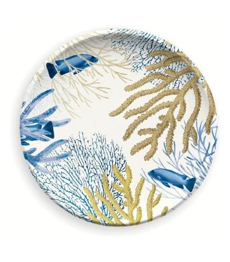 Scopri il fascino delle decorazioni Corallo con questo Set di Piatti da Dessert, con un design elegante arricchito da sfumature di blu e tocchi preziosi di oro, che simulano la luce del sole che penetra le profondità marine; grazie a questa decorazione fresca ed elegante sarà in grado di donare armonia e colore durante il pasto. Grazie a tecniche innovative, è stato riprodotta la fine trama e la luminosità tipica delle ceramiche, mantenendo però la durabilità con la melamina antigraffio, ideale per uso esterno o per una tavola informale. Il Set è composto da 6 pezzi di Piatti da Dessert. Caratteristiche tecniche: • 100% melamina • Per alimenti • Massima igienicità • Alta resistenza agli urti • Resistente agli shock termici • Finitura vetrificata con vernice trasparente di altissima qualità, per proteggere da macchie e graffi • Perfetta per l'outdoor e la tavola informale • BPA free • Lavabile in lavastoviglie • Da non usare in microonde e forno ...