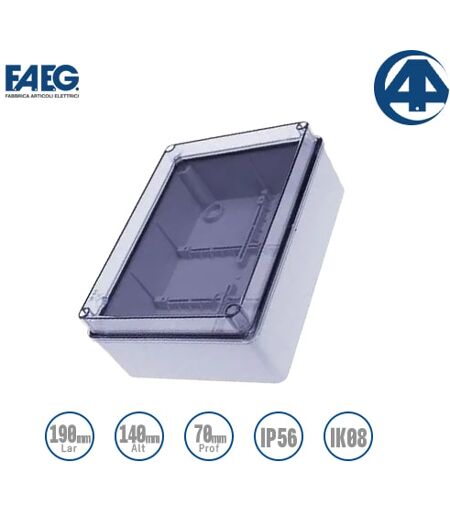 Faeg. Scatola stagna di derivazione rettangolare con coperchio trasparente con viti in metallo 190x140x70mm con pareti lisce IP56 ...