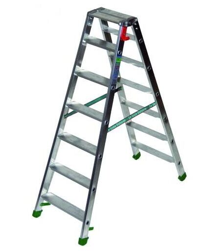 Struttura in alluminio, doppia salita, gradini larghi antisdrucciolo mm. 85 fissati con doppio passaggio idraulico, pratico gancio porta attrezzi, pianetto legato ai montanti tramite cerniera monoblocco in alluminio, piedini antiscivolo con calzari alti e distanziali antischiacciamento, particolarmente indicata per lavori professionali intensivi. Portata kg. 150. ...