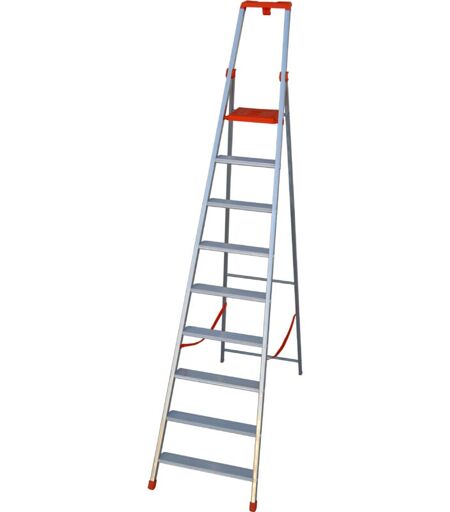 Struttura rinforzata, cerniere in resina con anima d’acciaio e frizione antigrip, gradini bloccati senza rivetti, portautensili e presa della mano, cinghie di sicurezza, piedini antiscivolo, portata kg. 150. Certificata EN131. ...