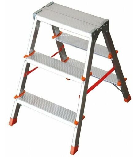 Struttura in alluminio, doppia salita, cerniere in acciaio, 4 diagonali di rinforzo, gradini antisdrucciolo mm. 80 con 6 rivetti, particolarmente indicato per aree domestiche, portata kg. 150, certificata EN131. ...