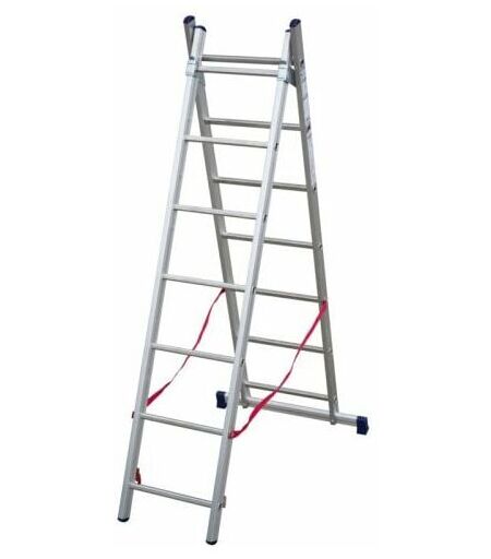 Mod. stilo in alluminio. Utilizzabile da appoggio, a cavalletto o a sfilo. Dotata di aste antiapertura in alluminio, base stabilizzatrice con tacchi maggiorati. Gradini mm 24x24 Portata 150 kg A norme europee EN 131 N. gradini 7 Altezza min/max cm 202/314 Sez ...