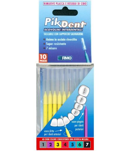 RIMUOVE PLACCA E RESIDUI DI CIBO PikDent SCOVOLINI INTERDENTALI TASCABILE CON CAPPUCCIO SALVAIGIENE - Anima in acciaio rivestito - Super resistente - 7 misure Prodotto per rimuovere placca e residui di cibo tra gli spazi interdentali e in prossimità di ponti e capsule. 6 misure cilindriche e una co… ...