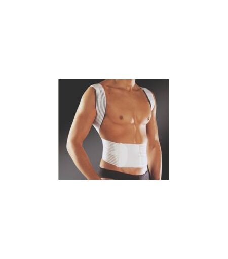 Raddrizzaspalle Indicazioni: patologie posturali: iper-cifosi - chiusura anteriore delle spalle. Caratteristiche: sostegno passivo, mantiene eretta la colonna evitandone l'inclinazione anteriore ed alleviando da carichi eccessivi la muscolatura cervicale. Il particolare sistema di incrocio posteriore delle due fasce, esercita un'azione di forza sulla muscolatura dorsale, la cui efficacia cresce proporzionalmente alla tensione data alla banda di chiusura a velcro posta anteriormente, sulla parete addominale. Facile da indossare e regolare. Indossato sopra una maglietta intima, garantisce il massimo comfort e puóessere indossato per tutta la giornata. Anallergico e 100% traspirante. Cod. 576 ...