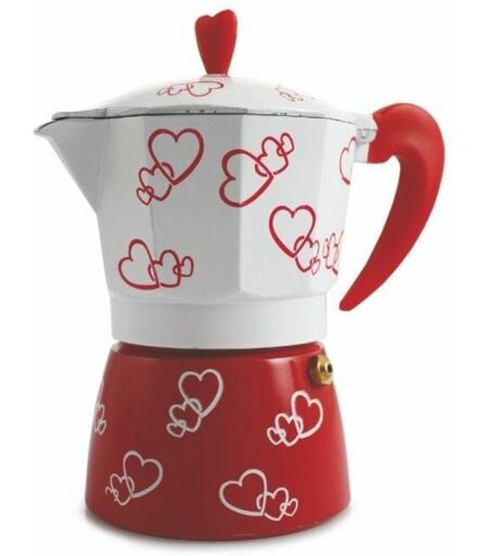 Caffettiera Cuore SìChef 2 tazze In alluminio Impugnatura e pomelli termoisolanti in plastica (PP) Con guarnizione in silicone Decoro cuori Può essere utilizzata su piastre a gas, elettriche e in vetroceramica. Misure: Ø 7,5 x h. 15 c ...