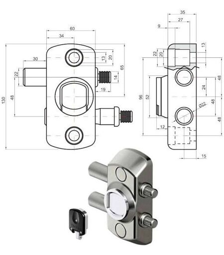Acciaio temprato finitura zincata Adatto per serrande - Reversibile Applicazione su montante con tasselli Interasse perni mm 48 sporgenza mm 30 Dimensioni mm 60x130x35 Apertura con chiave magnetica Dotazione 2 chiavi magnetiche KM0P85 Duplicazione chiave magnetica con Personal Card ...