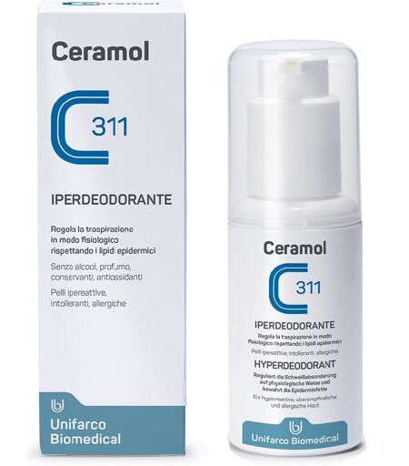 Ceramol 311 IperdeodoranteLimita la sudorazione e deodora con delicatezza attraverso il rilascio modulato nel tempo del principio attivo.La formulazione garantisce un’eccellente tollerabilità, ideale per pelli particolarmente sensibili o allergiche e rinforza la barriera cutanea.Indicato per pelli delicate, ipereattive, intolleranti ed allergiche e per ascelle irritate per stress meccanico (depilazione, sfregamento).Modo d'uso:Sulla pelle pulita ed asciutta applicare e massaggiare delicatamente 1 o 2 volte al giorno.Quantità consigliata: premere una volta lo stantuffo per ciascuna ascella.Ingredienti:Aqua, Aluminum chlorohydrate, Ppg-15 stearyl ether, Steareth-2, Steareth-21, Cholesterol, Ceramide 3, Stearic acid. ...