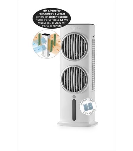 Ventilatore Tower - Potenza W 90 max - 2 Pale - Elegante raffrescatore evaporativo ad acqua che permette di ottenere aria fresca e pulita in qualsiasi ambiente. Le alette muovendosi da sinistra a destra generano un flusso d’aria di 80° e fino a 12 metri, il doppio dei normali raffrescatori. Comandi intuitivi controllabili direttamente dal pannello touch screen, dal telecomando. Tre diverse velocità fisse e tre diversi programmi di ventilazione a flussi variabili. Timer programmabile fino a 9 ore con spegnimento automatico. Silenzioso 63,9 dB(A). ...