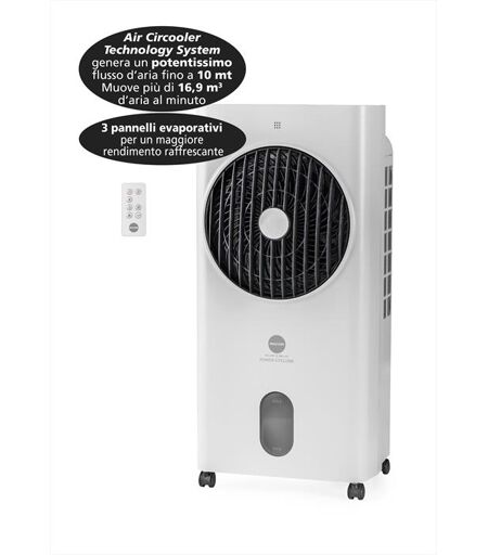Tower - Potenza W 60 max - 1 Pale - Raffrescatore evaporativo ad acqua che permette di ottenere aria fresca e pulita in qualsiasi ambiente. Flusso d’aria fino a 10 metri. La griglia ruotando in continuo a 360° genera un movimento dell’aria pari a 30°. Comandi intuitivi controllabili direttamente dal pannello touch screen o dal telecomando. Tre diverse velocità fisse e tre diversi programmi di ventilazione a flussi variabili. Timer programmabile fino a 8 ore con spegnimento automatico. Silenzioso 62,7 dB(A). ...