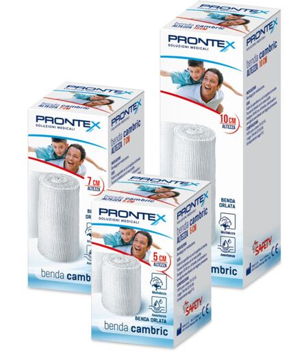 Prontex BENDA CAMBRIC Caratteristiche: benda orlata in puro cotone. Misure e codici: - 4mx5cm: 16260; - 4mx7cm: 16280; - 4mx10cm: 16300. ...