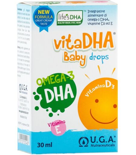vita DHA Baby drops - Descrizione Integratore alimentare a base di acido docosaesaenoico DHA da olio algale, vitamina D3 e vitamina E. L'assunzione quotidiana di 100 mg di DHA contribuisce al normale sviluppo delle capacità visive dei lattanti fino all'età di 12 mesi. Ingredienti Trigliceridi a med… ...