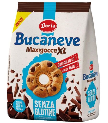 Doria - Bucaneve - Maxigocce XL - Descrizione Biscotto frollino con gocce di cioccolato specificamente formulato per celiaci. - Ingredienti Fecola di patate, farina di mais, zucchero, amido di mais, olio di semi di girasole, gocce di cioccolato fondente 13,1% (zucchero, pasta di cacao, burro di cac… ...
