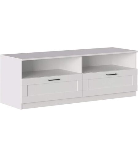 Mobile tv dal design classico e funzionale, dotato di comodi vani a giorno con foro passacavi sul retro e 2 ampi cassetti su guide con ruote, provvisto di dispositivo di fissaggio a parete anti-ribaltamento, perfetto per il soggiorno, salotto, camera da letto, made in italy, design italiano . ...