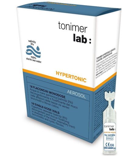 Tonimer Lab Hypertonic Aerosol - Descrizione Acqua di mare sterile ipertonica (salinità 3%) da utilizzare in aerosol, ad azione decongestionante e fluidificante del muco. Indicata nelle affezioni acute e croniche delle basse via aeree: bronchioliti del neonato e del bambino, fibrosi cistica. Adatta… ...