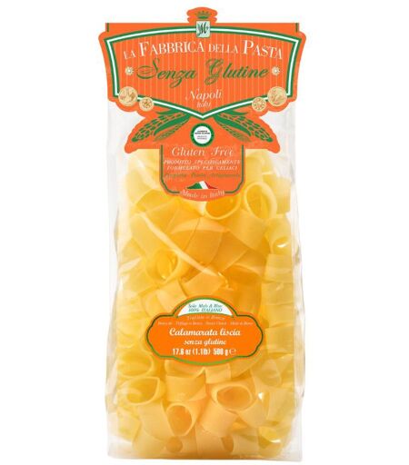Calamarata liscia - Prodotto dietetico a base di riso e mais, senza glutine. Prodotto con ingredienti non modificati geneticamente. Ingredienti Farina di mais 80%; farina di riso 20%. Caratteristiche nutrizionali per 100 g Valore energetico1505 kJ - 355 kcal Proteine7,0 g Carboidrati80 g Fibre1,2 g… ...