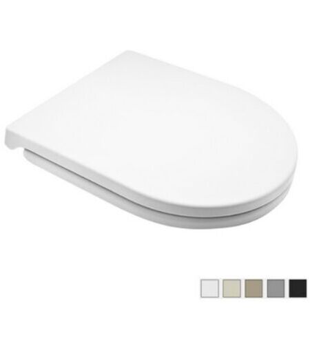 Sedile in termoindurente (Forma tipo 7) dedicato a casa ceramica RAK serie Feeling. Dimensioni: Lunghezza cm 39-43. Larghezza cm 36,5. interasse cerniere cm 12,5-14,5. Mod. con cerniere regolabili tipo C. Sgancio rapido. Soft Closing. ...