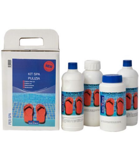 Per pulire, disincrostare e sterilizzare l'impianto e la vasca. Il Kit SPA PULIZIA contiene: 1 lt flacone Pulitore filtro. 1 lt flacone Pulitore Oil. 1 pz barattolo 1,5 kg disincrostante. 1 lt flacone Lapizzante. ...