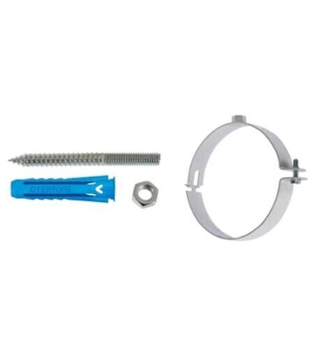 Materiale: DD11 EN 10111. Zincatura elettrolitica UNI ISO 2081:2009 sp. 6-9 um. verniciatura a polvere bianco RAL 9010 sp. 70-80 um. Fornito con tassello in nylon adatto per tutti i materiali base. Utilizzo per fissare tubi scarico fumi. ...