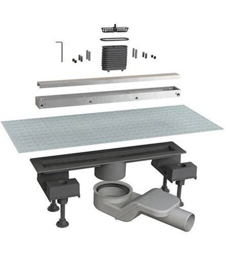"Canalissima" canaletta doccia per scarico pavimento. Il Kit comprendente griglia piastrellabile in alluminio, telo impermeabilizzante e sifone "Sogliola" scarico D.50mm. Materiale: Alluminio + ABS. Colore: Satinato + Nero. Applicazione: Per scarichi a pavimento.(DianFlex)Misura: L. 70 cm ...