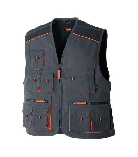 Gilet da lavoro canvas multitasche 48310 - 260 Gr. - 85% poliestere - 35% cotone - con inserti antiabrasione Dettagli: - Retina trasparente al carrè - Tasche e taschini di varie misure - Inserti antiabrasione sulle spalle - Zip frontale - Colore antracite, inserti arancio ...