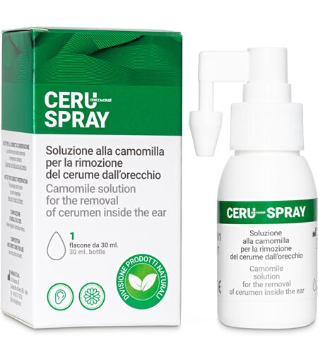 CERU SPRAY - Descrizione Dispositivo Medico. Soluzione alla camomilla per la rimozione del cerume dall'orecchio. Particolarmente indicato per la pulizia degli impianti audioprotesici. Spruzzato all'interno della cavità auricolare, aiuta a rimuovere i residui di cerume dall'orecchio senza produrre e… ...