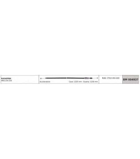 CAVO ACCELERATORE compatibile con HONDA per RASAERBA TOSAERBA TAGLIAERBA MODELLI: HRA 214-216 MISURE cavo: 1325 mm guaina: 1230 mm CODICE: 004937 CODICE ORIGINALE: 17910-VB4-800 EM ...
