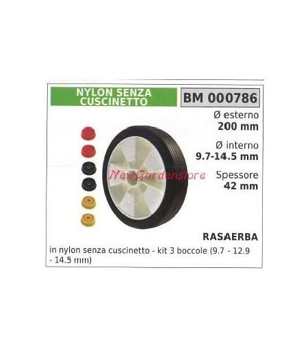 RUOTA PER RASAERBA TOSAERBA TAGLIAERBA IN NYLON SENZA CUSCINETTO Ø ESTERNO: 200mm Ø INTERNO: 9.7-14.5mm SPESSORE: 42mm KIT 3 BOCCOLE 9.7 12.9 14.5mm NEW GARDEN STORE Codice: 000786 Codice originale: AT ...