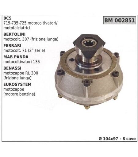 FRIZIONE CONICA COMPATIBILE CON: BCS PER MOTOCOLTIVATORE MOTOFALCIATRICE MODELLI: 715 735 725 COMPATIBILE CON: BERTOLINI MOTOCOLTIVATORE MODELLI: 307 (FRIZIONE LUNGA) COMPATIBILE CON: FERRARI MOTOCOLTIVATORE MODELLI:71 (2° SERIE) COMPATIBILE CON: MAB PANDA MOTOCOLTIVATORE MODELLI: 135 COMPATIBILE CON: BENASSI MOTOZAPPA MODELLI: RL 300 (FRIZIONE LUNGA) COMPATIBILE CON: EUROSYSTEM MOTOZAPPA CON MOTORE A BENZINA Ø 104X97 8 CAVE Codice: 003145 Codice originale: AT ...
