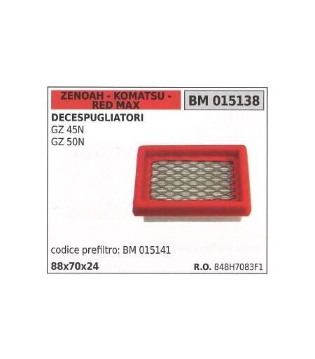 FILTRO ARIA COMPATIBILE CON: DECESPUGLIATORE MODELLI: GZ 45N GZ 50N CODICE PREFILTRO: BM 015141 88X70X24 ZENOAH - KOMATSU - RED MAX 015138 Codice originale:848H7083F1 ...