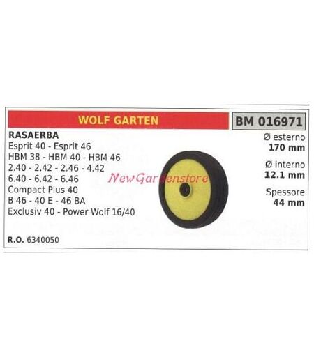 RUOTA PER RASAERBA TOSAERBA TAGLIAERBA ESPIRIT 40 46 HBM 38 40 46 2.40 2.42 2.46 4.42 6.40 6.42 6.46 COMPACT PLUS 40 B 46 40E 46BA EXCLUSIV 40 POWER WOLF 16/40 Ø ESTERNO: 170mm Ø INTERNO: 12.1mm SPESSORE: 44mm WOLF GARTEN Codice originale: 6340050 AT ...