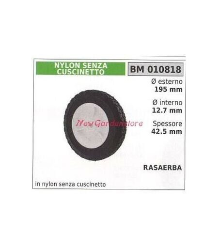 RUOTA PER RASAERBA TOSAERBA TAGLIAERBA IN NYLON SENZA CUSCINETTO Ø ESTERNO: 195mm Ø INTERNO: 12.7mm SPESSORE: 42.5mm NEW GARDEN STORE Codice: 010818 Codice originale: AT ...