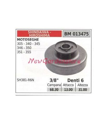 PIGNONE PER MOTORE MOTOSEGA 305 340 345 346 350 351 355 3/8" DENTI 6 CAMPANA : 68.30 ATTACCO: 13.00 ALTEZZA: 31.00 SHINDAIWA-HIROSHIMA Codice: 013475 Codice originale: ...