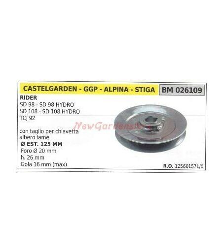 Puleggia tendicinghia per trattorino tagliaerba rasaerba tosaerba Rider SD98 SD98 HYDRO 108 108 HYDRO TCJ92 con taglio per chiavetta albero lame Ø ESTERNO 125mm h Ø 26mm foro Ø 20mm Gola 16mm (max) CASTELGARDEN - GGP - ALPINA - STIGA Codice: 026109 Codice originale: 125601571/0 AT ...
