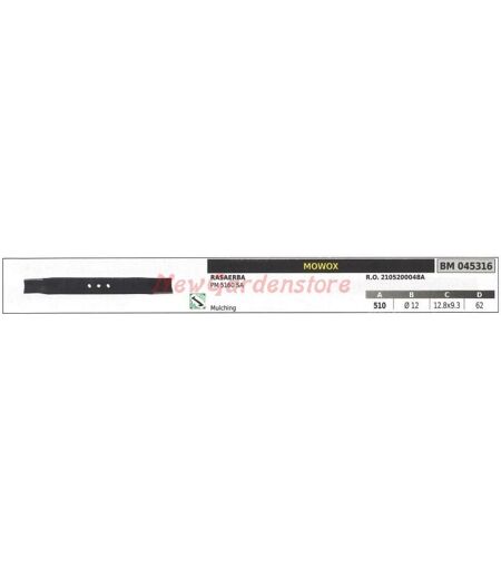LAMA PER RASAERBA TOSAERBA TAGLIAERBA PM 5160 SA A: 510mm B: Ø12mm C: perni Ø 12.8x9.3mm D: 62mm A: lunghezza in mm B: foro centrale C: fori laterali D: interasse MOWOX Codice: 045316 Codice originale: 2105200048A AT ...