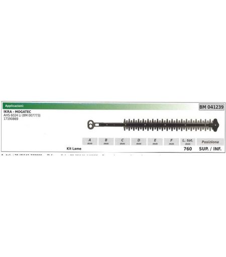 LAMA INFERIORE / SUPERIORE TAGLIASIEPE AHS 6024 Li BM 007773 17190869 A: B: C: D: E: F: LUNGHEZZA TOTALE: 760mm IKRA - MOGATEC Codice: 041239 Codice originale: AT ...