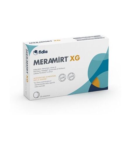 Gli integratori non sostituiscono un’alimentazione equilibrata e variegata e uno stile di vita sano.MERAMIRT® XG è un integratore alimentare a base di Riso Nero, estratto di Verbasco, Luteina e Zinco. Lo Zinco contribuisce al mantenimento della capacità visiva normale, alla protezione delle cellule dallo stress ossidativo, al metabolismo della Vitamina A, e supporta la normale funzione del sistema immunitarioIngredientiAgenti di carica: cellulosa microcristallina, carbossimetilcellulosa semi e.s. tit. 20% in Oryza sativa sodica reticolata; Riso nero Antocianine ; Luteina al 10% L., amido alimentare Tagetes erecta da Luteina; Amido di mais; Zinco gluconato; Verbasco foglie e.s. tit. 10% in Polifenoli ; Agenti antiagglomeranti: Sali di magnesio degli acidi grassi, Biossido di silicio e talco; agenti di filmatura: Alcole polivinilico (Pva), Carbonato di Calcio, Idrossi-propil-metilcellulosa, Polietilenglicole, Talco, Complessi delle clorofille e delle clorofilline con rame, Indigotina.Valori nutrizionali Contenuti medi per dose giornaliera Riso nero e.s. di cui antocianine (come cianidina-3-glucoside) 200 mg 40 mg Verbasco e.s. di cui polifenoli (come verbascoside) 40 mg 4 mg Luteina FloraGLO 12 mg Zinco 10 mg (100% Vnr*) Assunzione consigliataSi consiglia l’assunzione giornaliera di 2 compresse, da deglutire con acqua.Avvertenze:Non superare la dose giornaliera raccomandata. Tenere fuori dalla portata dei bambini al di sotto dei tre anni. Conservazione:Conservare in un luogo fresco e asciutto. Si prega di fare riferimento, se necessario, ad ulteriori istruzioni riportate sulla confezione.Contenuto netto20 compresse da 500 mgProduttoreFidia Farmaceutici S.p.A. Via Ponte della Fabbrica 3/A35031 Abano Terme, PD Italia ...