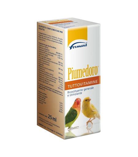 Piumedoro TUTTOVITAMINE - Descrizione Piumedoro Tuttovitamine è un alimento complementare per uccelli da gabbia e da voliera, colombi da gara e ornamentali composto da costituenti naturali, vitamine, minerali e oligoelementi essenziali per le varie fasi della vita e indispensabili nei momenti di ma… ...