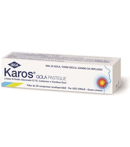 IBSA - Karos - GOLA PASTIGLIE a base di Sodio Ialuronato - Per USO ORALE - Gusto Limone - - - Indicazioni e caratteristiche del prodotto Karos Gola pastiglie grazie al film idratante e protettivo che forma con la saliva è indicato in tutti i casi di mucosa orale infiammata quali: affezioni d… ...