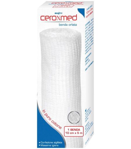 Ceroxmed - BENDA ORLATA - Componenti: - Benda orlata in garza idrofila di puro cotone. Sigillata e astucciata, disponibile in diverse altezze, leggera e morbida, si taglia su misura e garantisce massima igiene. - Formato: - 5mx10cm. ...