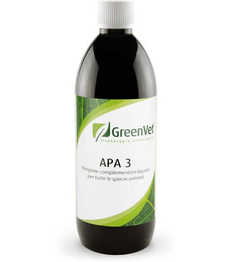 APA 3 - Descrizione Mangime complementare liquido. Modalità d'uso 6 - 8 gocce per kg di peso. Formato Bottiglia da 500 g. Cod. IZ317 ...