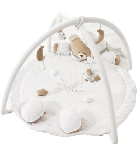 La palestrina Nanan Tato e un luogo magico, di gioco e di apprendimento. Un morbido tappeto di ciniglia, leggermente imbottito con fibra di ovatta, da cui spuntano la testa ed i piedi del tenero orso. Stelline sonore, cuoricini, lune e orsetti appesi stimolano le prime percezioni e la fantasia del bebe. ...